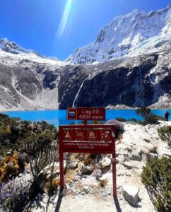 12:00 m. aprox. Llegaremos a la Laguna 69 después de 3 horas de ardua caminata, y podremos disfrutar de la vista y sus agua color celeste turquesa. Apreciaremos los nevado como el Chacraraju (6112 msnm), Pisco (5752 msnm) y Yanapaqcha (5460 msnm). Después de recibir las indicaciones del guía, descenderemos por el mismo sendero por el que subimos.